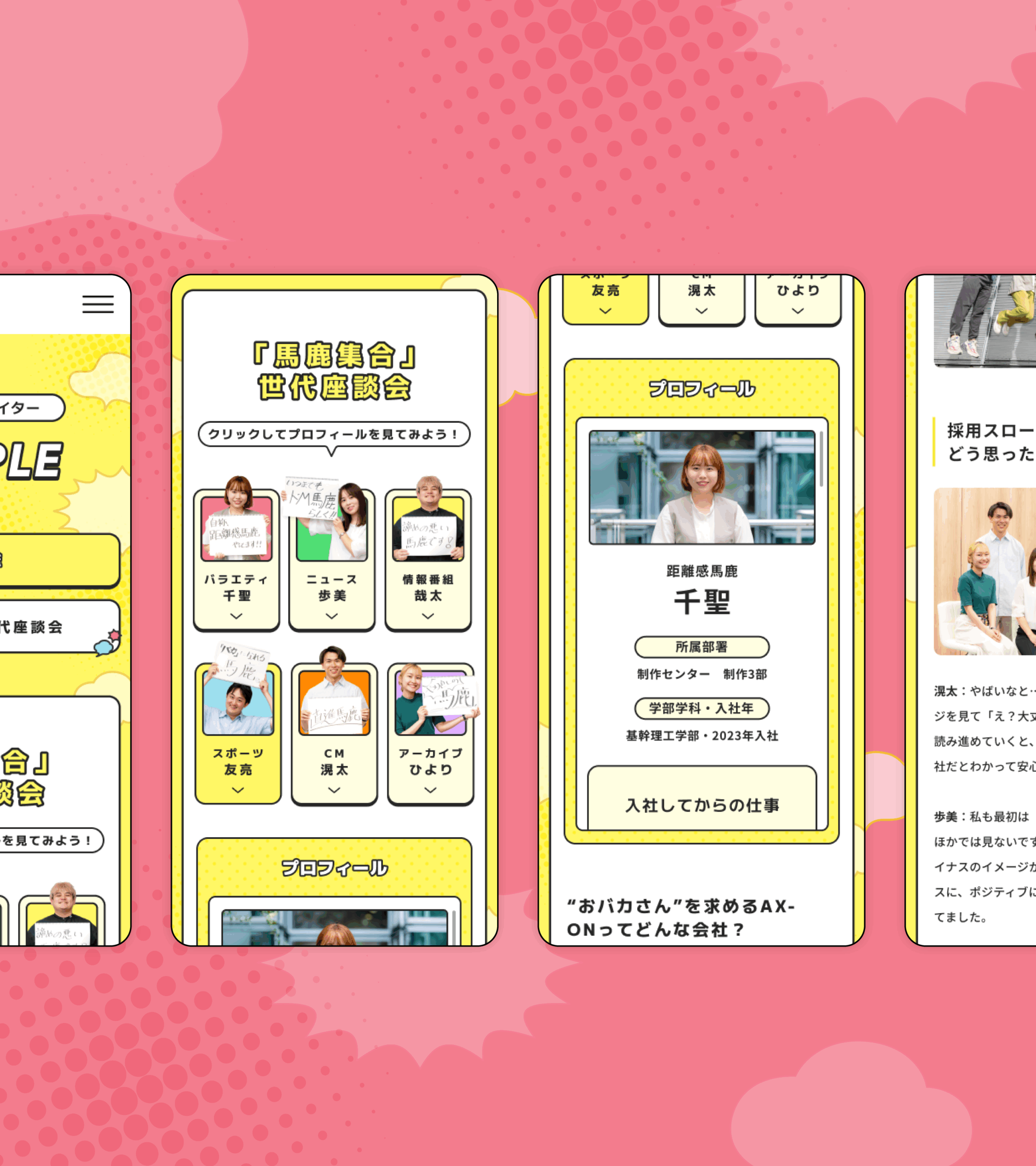 配置では、日テレアックスオン様のボリュームある充実した既存コンテンツを、就職活動生に向けてわかりやすくコンパクトに、かつ網羅的に伝えることを重視しています。一例として、会社について伝える「COMPANY」では、パパママクリエイターへのインタビュー・研修制度・福利厚生の3項目を1ページの中でタップで切り替えられるように。インタビューも人ごとにタップで記事が切り替わり、ボリュームあるプロフィールもスクロールして一つのサイズに収まるように設計しています。