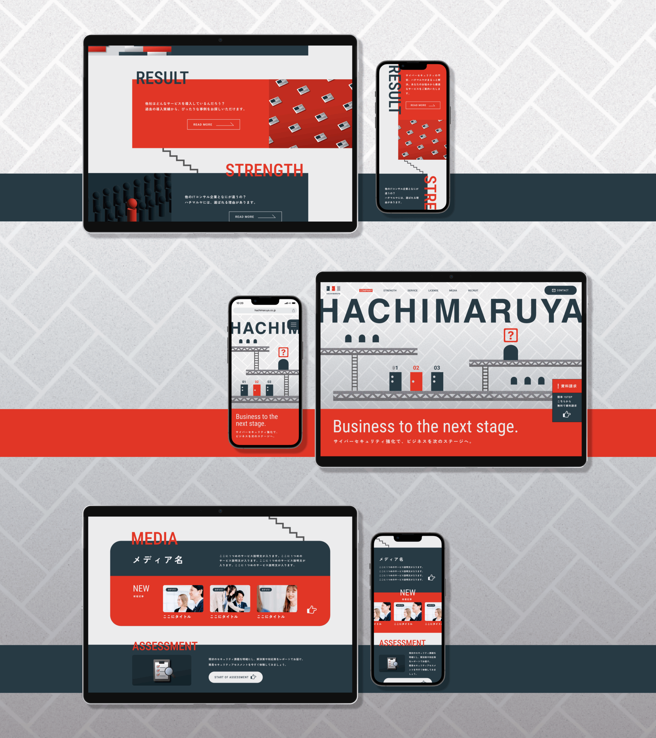 IT及びサイバーセキュリティ領域のコンサルティング、ソリューション導入、運用支援などの事業を展開するハチマルヤ合同会社のコーポレートサイト、ロゴ、名刺制作を担当しました。