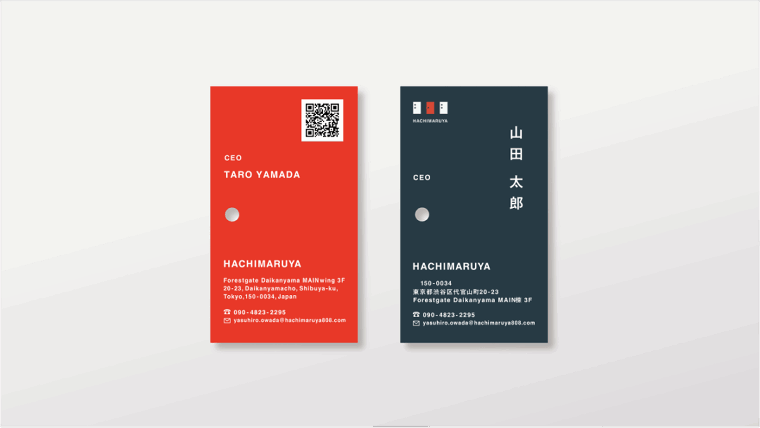 ロゴやサイトと連動させるかたちで制作した名刺は、縦方向に向けてドアが3つ並んでいるかたちに。両面印刷で片面ずつ、赤色とネイビーをベースカラーにしています。1枚の名刺をドアに見立て、ドアノブを穴でくり抜くなど個性感あふれる名刺に仕上げました。