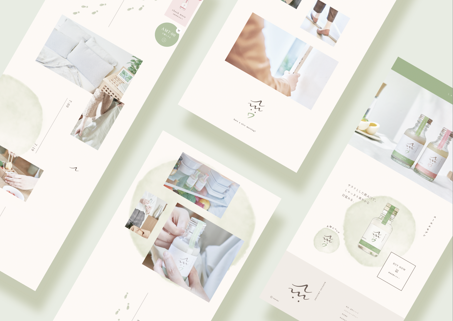 ウェブサイトもコンセプトに連動して、ユーザーの体験に合わせて構築しています。サイト上の「am7」をクリックすると、朝の時間帯ごとのユーザーの動きを写真とともに展開。ベットで起床するところに始まり、スクロールして時間を追うごとに、お弁当の準備、出勤の準備、出社前にAM7を手に取り、飲んでから家を出るといった「ストーリー調」に仕上げています。