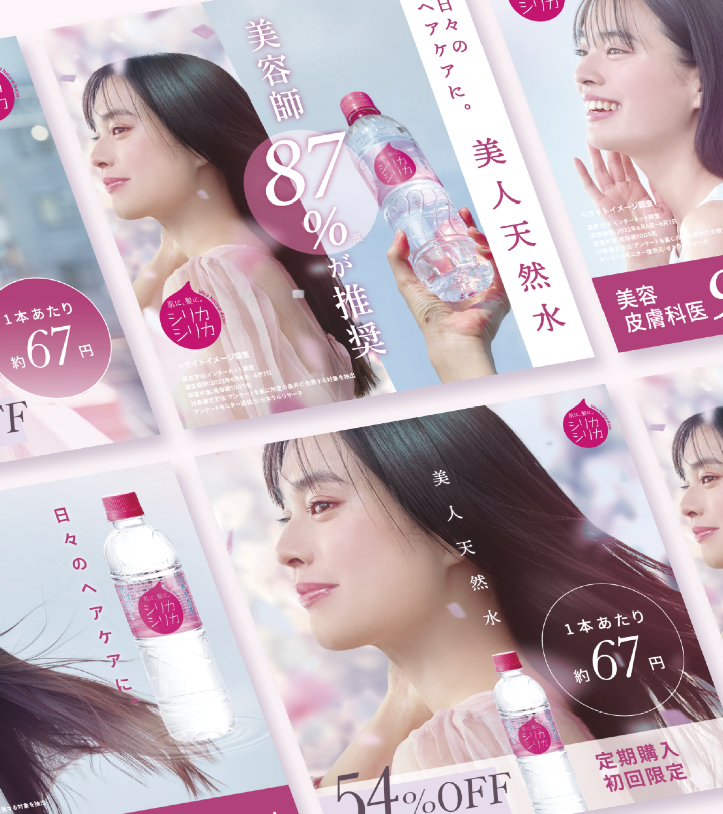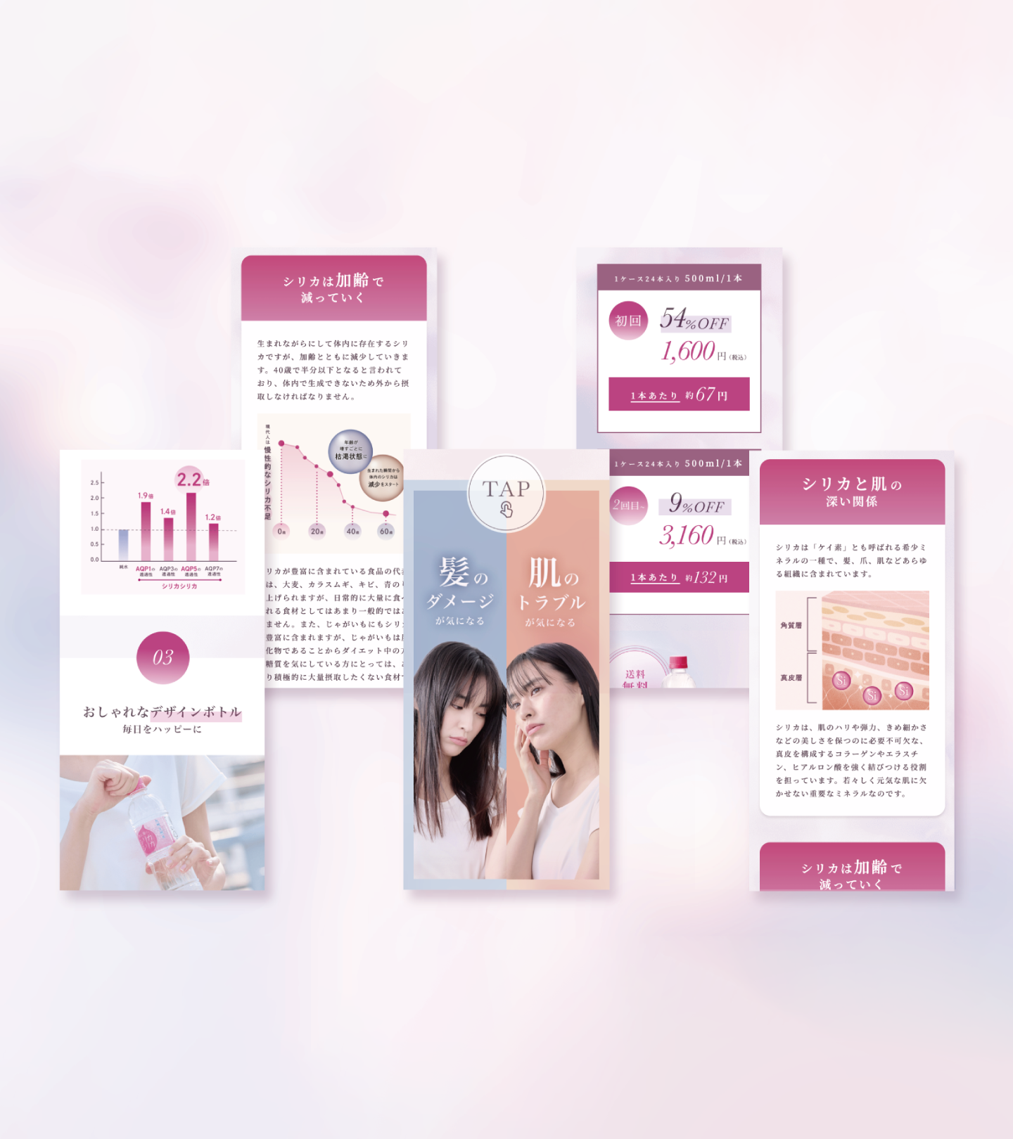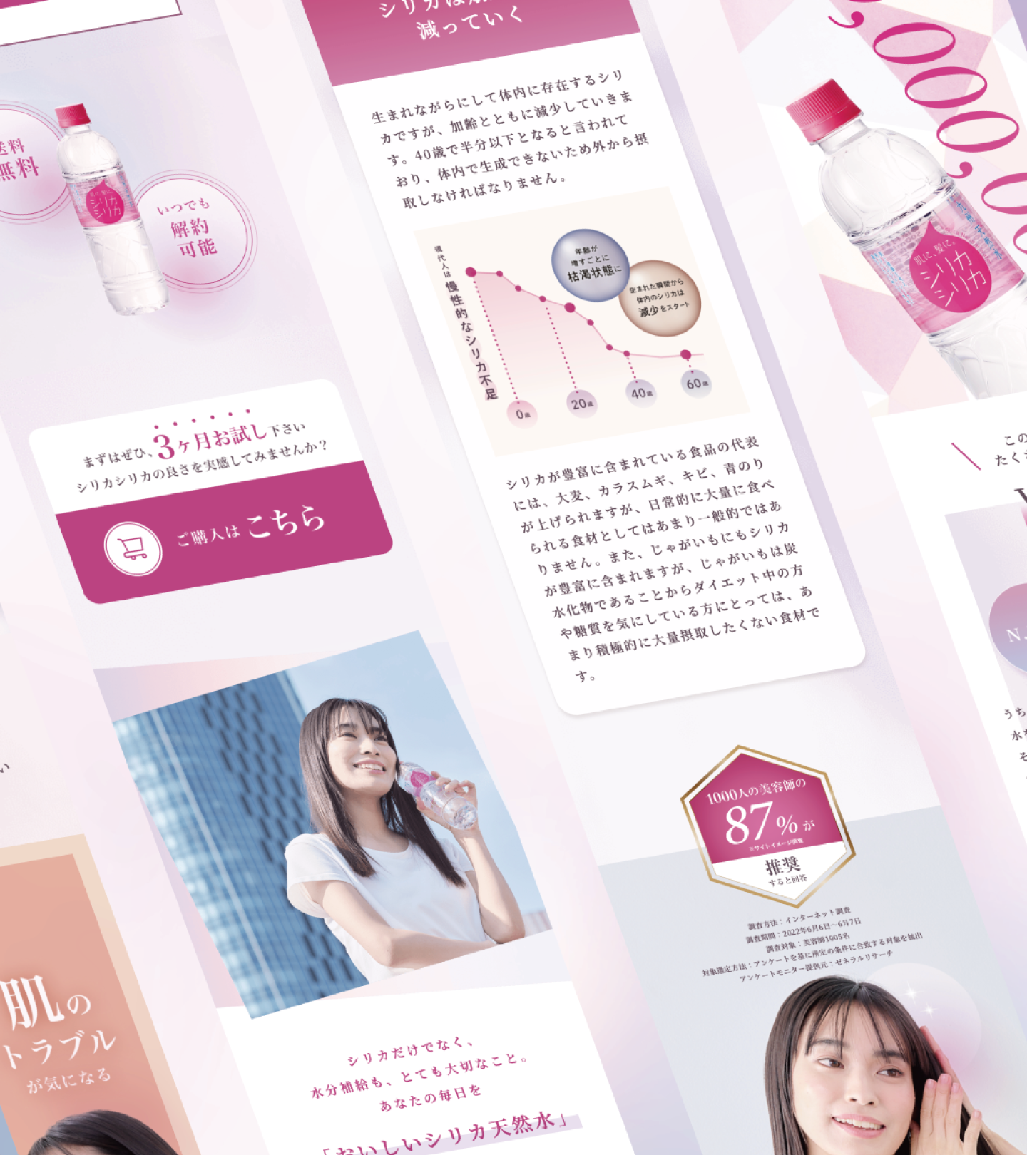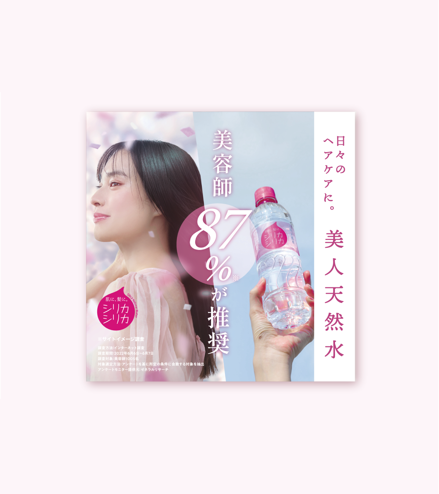 コラーゲンやケラチンの生成をサポートする美のミネラル、シリカ。そんな女性の美と健康を支える、九州天然水「シリカシリカ」のLP制作を担当しました。