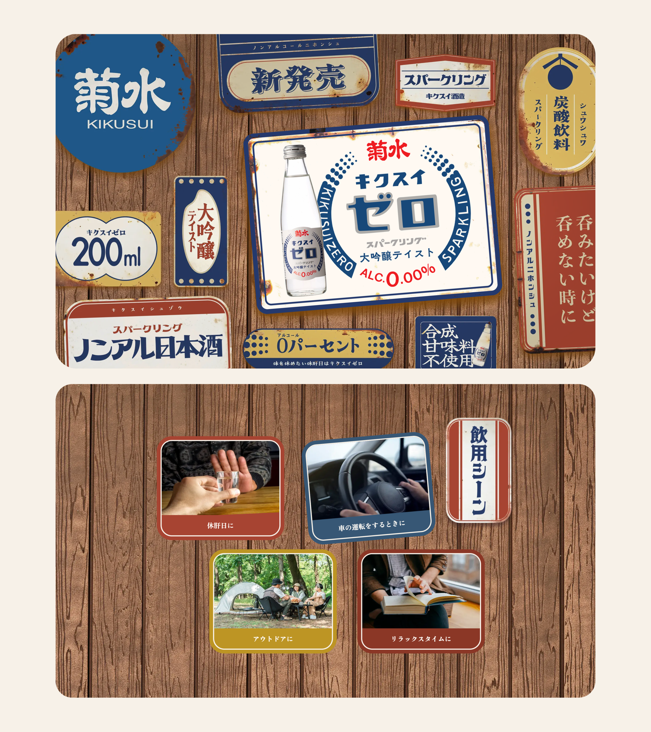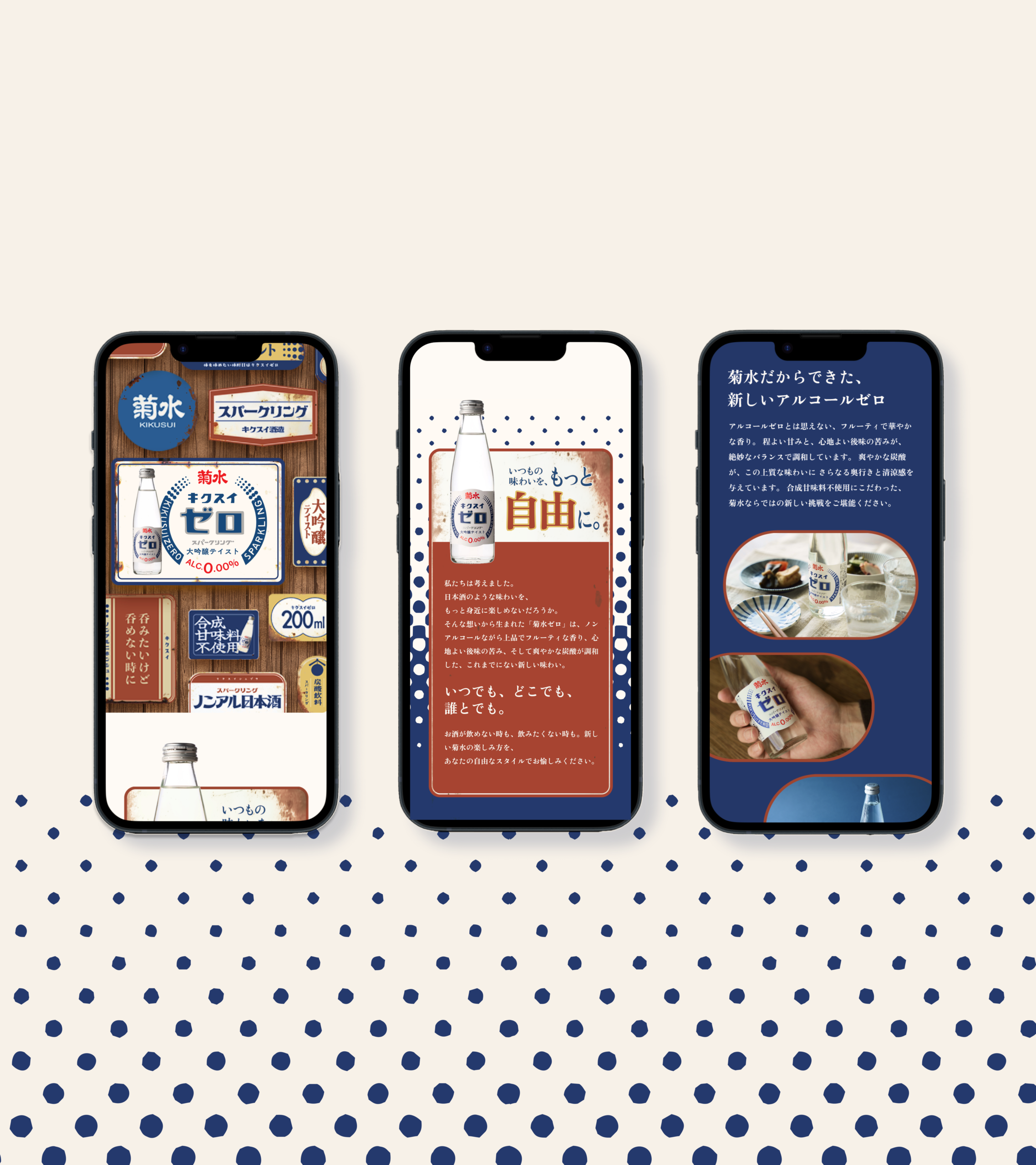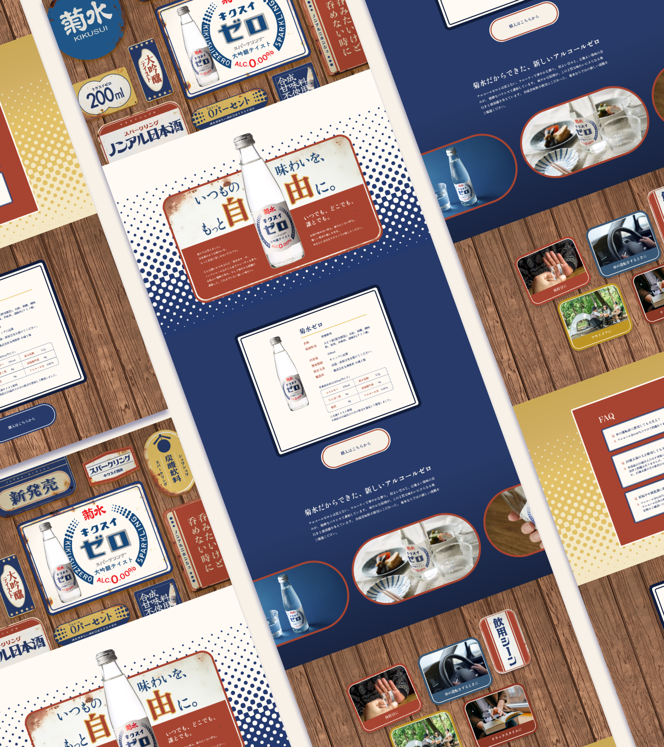 ところどころに施された水玉模様は、実際の商品ラベルと連動するかたちになっていると同時に、ページ全体にメリハリをつける意図もあります。カラーはラベルにあるネイビーや赤を使用しながら、黄色も追加。昭和レトロな世界観も演出しながら、「菊水ゼロ」の個性も打ち出しました。