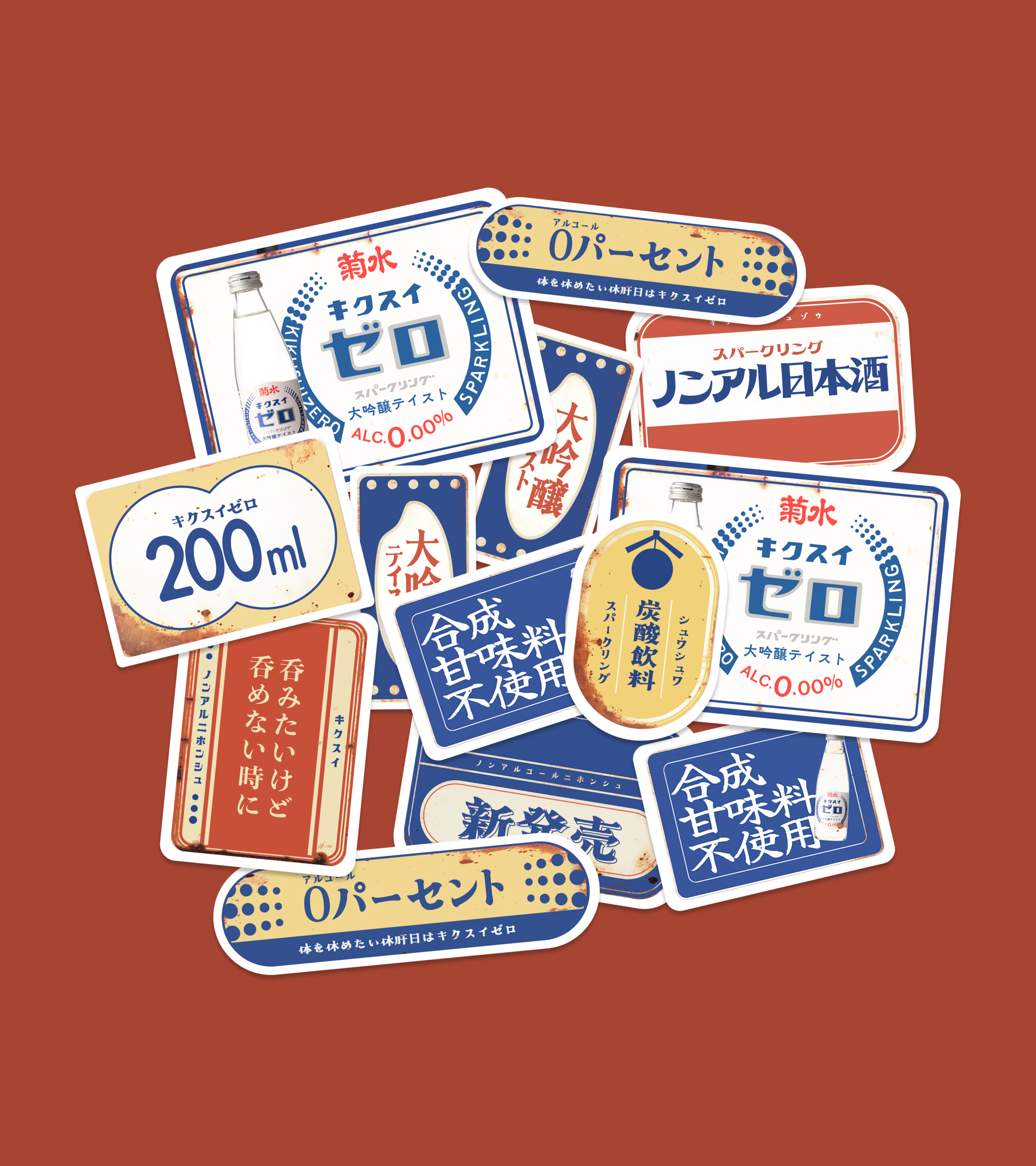 当時の新聞の広告風に仕上げる案や、ちゃぶ台の真ん中に商材を置く案など、さまざまな方向性が出てきたなかで、菊水酒造様からもご評価いただいた昭和の看板が並んでいるレトロさで世界観を深めていきました。