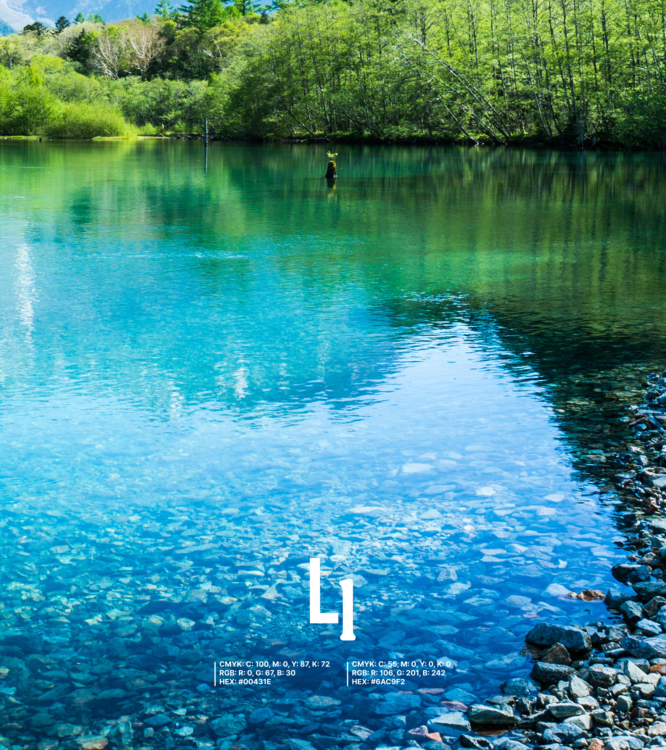 そこでカラーには、深緑と水色を使用し、深い森から湧き出た水が川となり、流れながら広がっていく情景をイメージしています。水は深い場所ほど暗く、下流へ進むにつれて明るく見えることから、その自然の色の移ろいをグラデーションで表現しました。